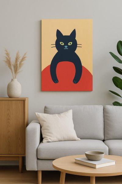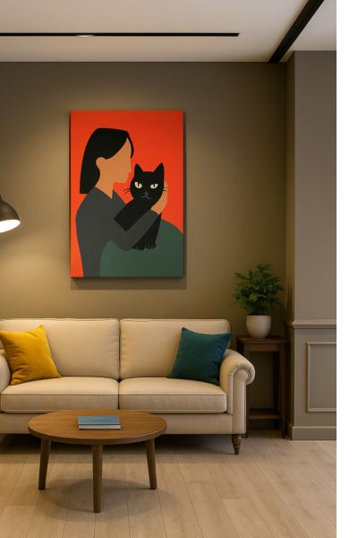 Usé colores vibrantes, contrastes y líneas depuradas, apoyándome en la geometría y en la ausencia de rostros humanos. Quise que el espectador no se detenga en quién es la persona, sino en la figura del felino y en lo que representa el vínculo. La ausencia de rostro es intencional: permite que la obra “haga eco” en quien la mira, que el vacío se llene con su propia imaginación, sus recuerdos y sus valores. Así, la escena se completa en su mente y puede escalarse sin límites.