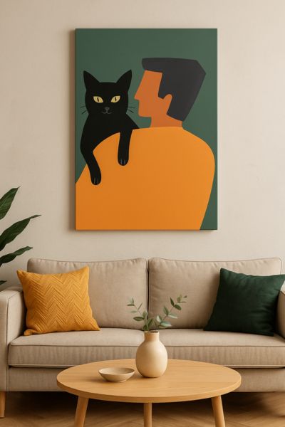 En Serena Intuición, la figura masculina aparece de perfil, pero no de espaldas: su mirada se inclina hacia el hombro izquierdo, justo donde el gato negro se apoya con seguridad. Esta escena conecta con quienes encuentran en el hogar un refugio sereno, donde la compañía felina despierta fragilidad y necesidad de contención. La energía del hombre —más racional y contenida— dialoga con la vitalidad penetrante del gato, creando una dupla de complicidad silenciosa.